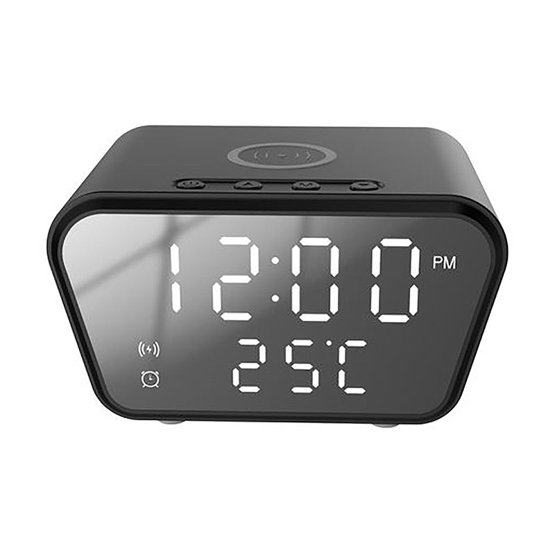 Ten innowacyjny Budzik z ładowarką bezprzewodową Qi to znacznie więcej niż zwykły zegar. Jego lustrzany wyświetlacz LED, widoczny na pierwszy rzut oka, prezentuje nie tylko aktualną godzinę (taką jak 12:00 PM na zdjęciu!), ale również precyzyjnie mierzoną temperaturę (np. 25°C). Ale to, co naprawdę wyróżnia ten budzik, to zintegrowana ładowarka bezprzewodowa Qi na jego górnej powierzchni. Po prostu połóż swój kompatybilny smartfon na budziku i obudź się z pełną baterią, bez konieczności podłączania jakichkolwiek kabli. To czysta wygoda i elegancja w jednym urządzeniu, idealnym do sypialni, biura czy salonu.