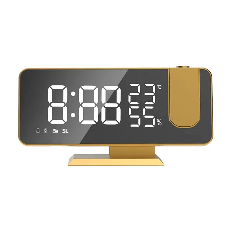 Nasz nowoczesny radiobudzik z projektorem czasu został zaprojektowany z myślą o Twojej wygodzie. Główną atrakcją jest regulowany projektor, który pozwala na wygodne odczytanie godziny bez konieczności odwracania głowy. Wyraźny wyświetlacz LED o dużych cyfrach pokazuje nie tylko czas, ale także aktualną temperaturę i poziom wilgotności, pomagając Ci monitorować komfortowe warunki w pomieszczeniu. Wbudowane radio FM pozwoli Ci budzić się delikatnymi dźwiękami ulubionej audycji lub odprężyć się przed snem. Intuicyjne sterowanie i funkcja drzemki zapewniają pełną kontrolę nad Twoim porankiem, a elegancka złota obudowa dodaje klasy Twojej sypialni.