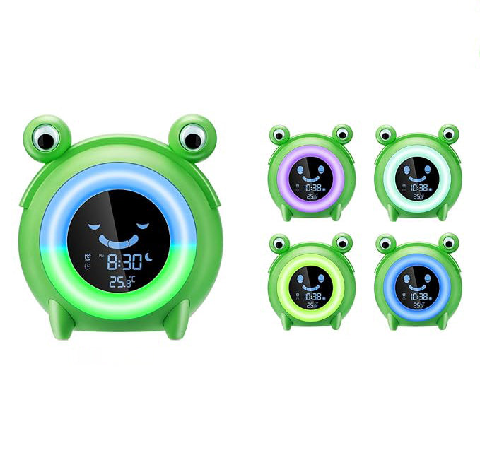 Czy Twoje dziecko ma problem ze wstawaniem rano, a wieczorne zasypianie to prawdziwa walka? Poznaj naszego uroczego, zielonego przyjaciela – Zielony Budzik Żabka Trener Snu, który raz na zawsze odmieni rutynę snu i pobudek w Twoim domu! Ta fantastyczna żabka z wesołą buzią to znacznie więcej niż zwykły budzik. Zaprojektowany z myślą o najmłodszych, pomaga dzieciom zrozumieć cykl dnia i nocy w prosty, intuicyjny sposób, dzięki czemu zarówno poranki, jak i wieczory stają się spokojniejsze i bardziej przewidywalne. Jego jasny, cyfrowy wyświetlacz z godziną i temperaturą, otoczony delikatnym, zmieniającym kolory światłem, tworzy magiczną atmosferę w pokoju, zachęcając malucha do współpracy i budowania zdrowych nawyków.